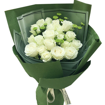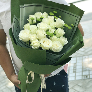 精选19枝白玫瑰,绿色雏菊间插