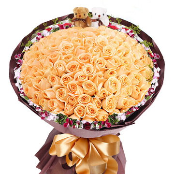 99朵香槟玫瑰,粉色石竹梅丰满围边,随机赠送两只可爱小公仔