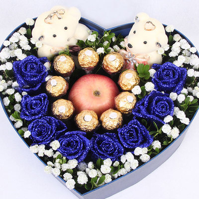 8朵蓝色妖姬+9颗费列罗巧克力+情侣小熊一对+苹果一个,绿叶满天星丰满点缀。