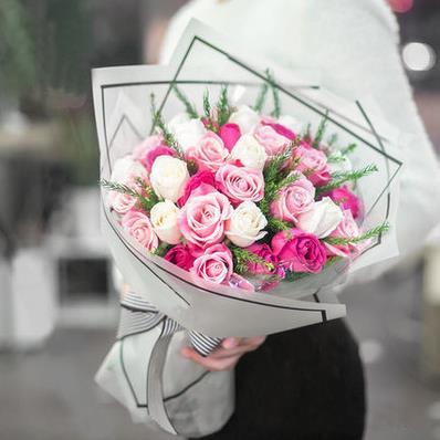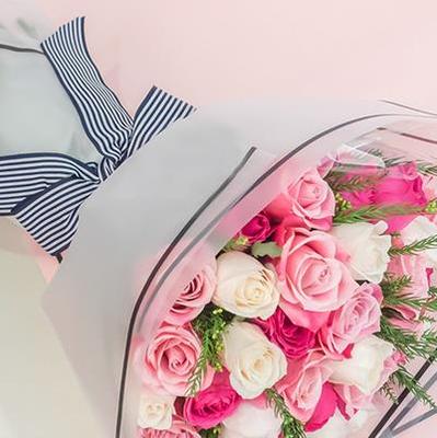 33朵戴安娜、白玫瑰、大桃红玫瑰混搭,马尾松针间插