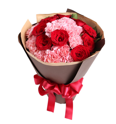 13枝粉康乃馨,9枝红玫瑰,周边搭配适量绿叶。