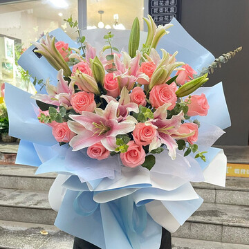 19朵戴安娜粉玫瑰,5支多头粉百合,尤加利间插