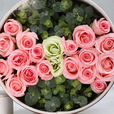 精选19朵戴安娜玫瑰,搭配2朵桔梗,尤加利丰满。