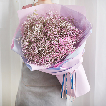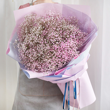 粉+蓝欧雅纸扇形包装,蓝色英文丝带束扎花语:你的大眼睛扑闪扑闪,我从里面看到了星光附送:
