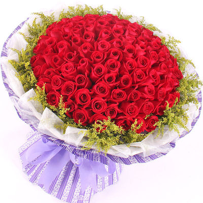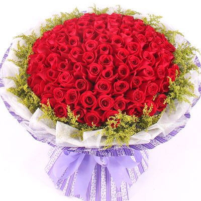 精选99朵红玫瑰,黄莺丰满点缀。