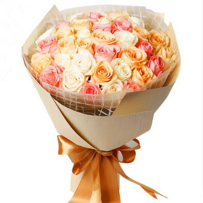 透明纹路纸内衬,牛皮报纸外围圆形包装,精美蝴蝶结束扎花语:珍惜丝丝缕缕绽放的珍贵,用坚毅守护内心的永恒。附送: