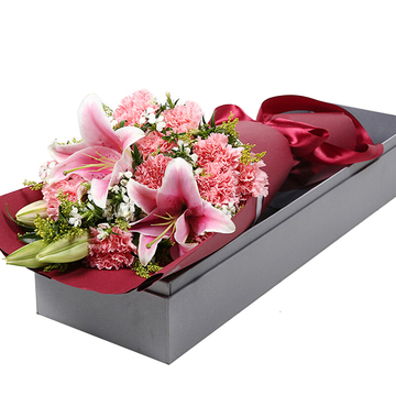 19朵粉康乃馨,多头粉百合2枝,石竹梅、黄莺搭配