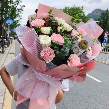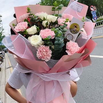 9支粉色康乃馨、5支白玫瑰,搭配尤加利叶