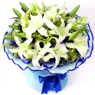 蓝色卷边纸圆形包装,深蓝色丝带系蝴蝶结。花语:只有您春露般的浇灌、辛勤的耕耘、才有满园花开的芬芳,是您创造了灿烂无边的奇迹。附送: