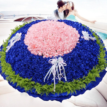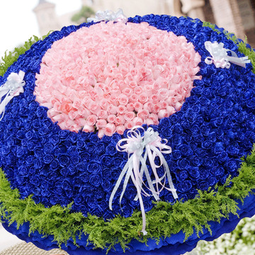 蓝色妖姬和戴安娜共520朵,黄莺或满天星丰满围边,白色丝带花结四个