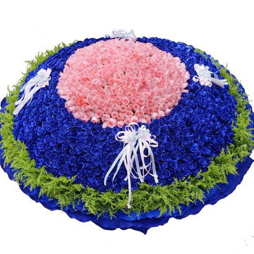 蓝色卷边纸双层圆形包装,蓝色缎带束扎花语:今生别无所求,只求与你到永久;今世别无他求。只求与你长相守;我要与你长相厮守,缠缠绵绵到永久。附送: