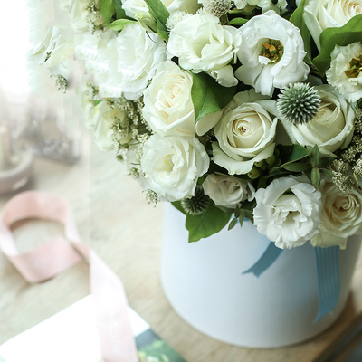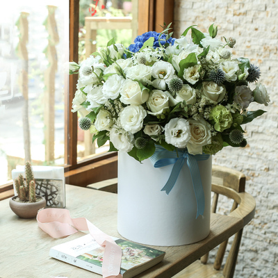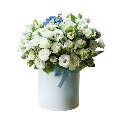 白色抱抱桶配蓝色条纹蝴蝶结精美包装花语:玫瑰,你的;巧克力,你的;钻戒,你的;你,我的。附送: