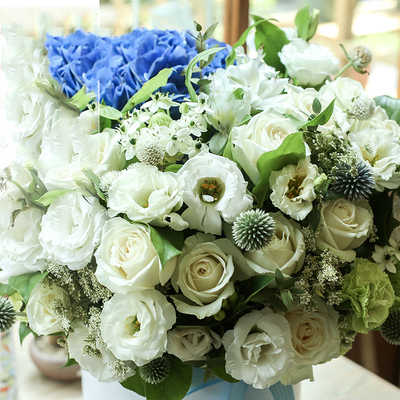 19朵白雪山,5支多头白色洋桔梗,1朵蓝色绣球,小刺芹等搭配