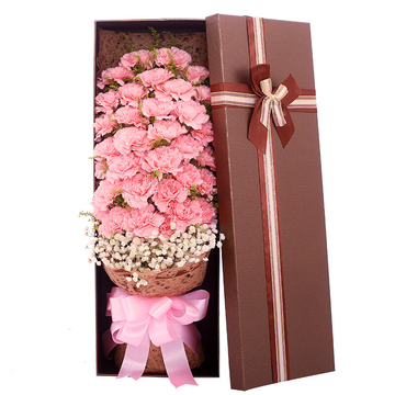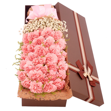 咖啡色落水纸扇形包装,粉色缎带束扎,长方形礼盒(颜色随机)花语:温馨的康乃馨花礼,里面满满心意跟感动,精致小巧的用意,等待着您温暖的双手打开,带给您无限的感谢,谢谢您这一生给我的无限温情。附送: