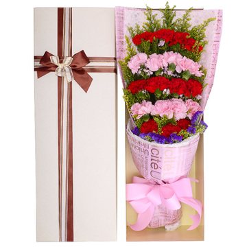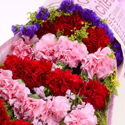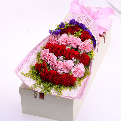 11枝红康乃馨,8枝粉红康乃馨,黄莺勿忘我间插点缀。