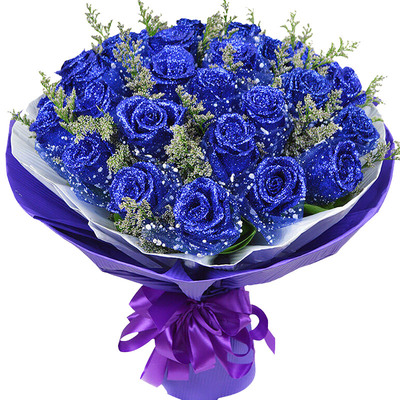 每朵蓝妖用蓝色雪点纱网包裹,内衬白色素纸,外层紫色素纸圆形包装,紫色缎带束扎花语:我对你的爱,像那蓝色萤火,在黑夜里闪放着迷人的光!附送: