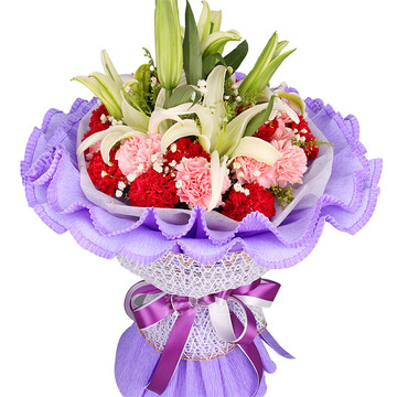 内衬白色绵纸,外层紫色卷边纸双层圆形包装,金边w纱网束腰,紫色及白色缎带束扎花语:慈母手中线,游子身上衣!妈妈,我想你了~附送: