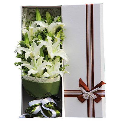 内衬白色包装纸,绿色包装纸外围,系蝴蝶结,精美白色长方形礼盒。花语:爱情是恒久的誓言,忍耐是拥有的起点,想拥有甜蜜的春天你要自我改变,幸福的爱来之不易,我们用生命去珍惜,要有勇气不弃不离,守护那平淡的琐碎烦心。附送: