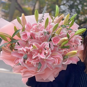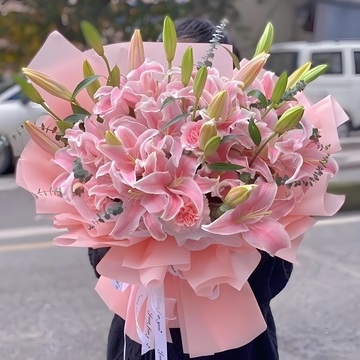 12枝粉色香水百合,4朵粉色康乃馨,搭配尤加利也。