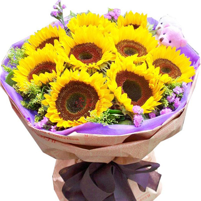 9朵向日葵,2只情侣小熊,勿忘我、黄莺点缀。