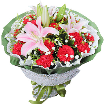 19朵红色康乃馨,2枝多头粉百合,满天星点缀,黄莺间插