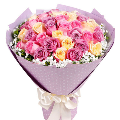 33朵混搭玫瑰,安娜+紫玫瑰+香槟玫瑰各11朵,白色石竹梅围边