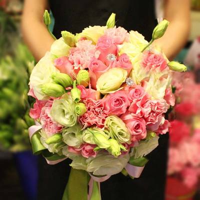 11朵粉玫瑰,10朵粉色康乃馨,绿色桔梗点缀。