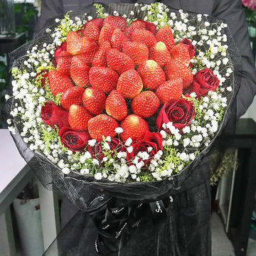 29颗草莓,11朵红玫瑰,白色满天星丰满围边,黄莺间插