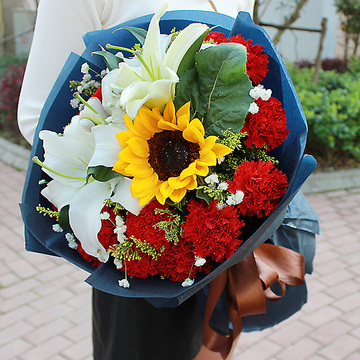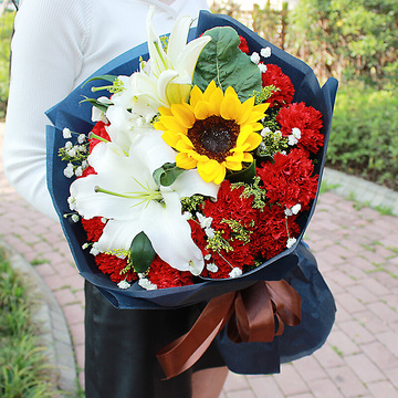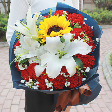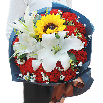 19支红色康乃馨,2枝多头白百合,1支向日葵,黄莺间插,满天星点缀