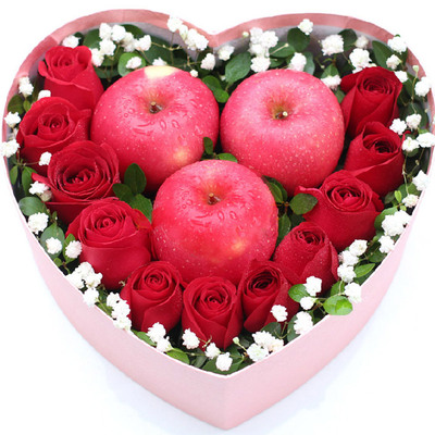 苹果3个,11朵红色玫瑰环绕放置,点缀满天星绿叶