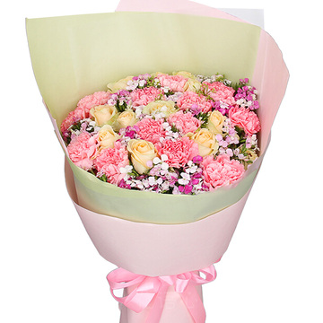 13朵粉色康乃馨,11朵香槟玫瑰,粉色石竹梅丰满间插