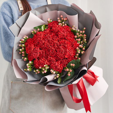33朵红色康乃馨,红豆丰满围边,搭配绿叶