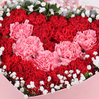 精心挑选18朵红色康乃馨,5朵粉色康乃馨,满天星,栀子叶外围。
