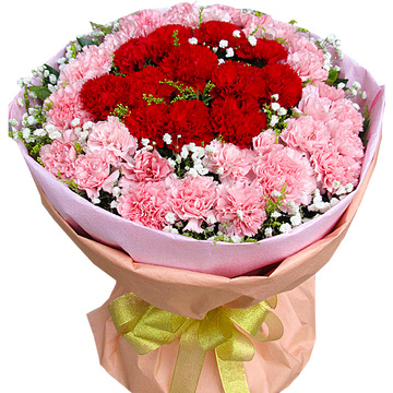 12朵红色康乃馨,40朵粉色康乃馨,满天星、黄莺、栀子叶搭配