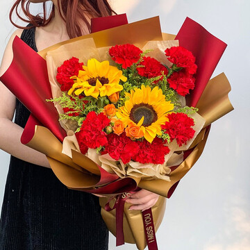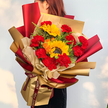 11朵红康,2支向日葵,1支橙色泡泡,黄莺丰满搭配;