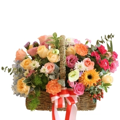 精美花篮包装花语:缘分让爱情变成可能。爱情事一场毫无征兆的邂逅。附送: