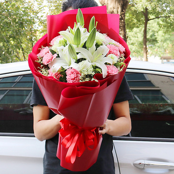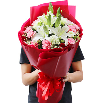 19支粉色康乃馨,2枝白桔梗,2枝多头白百合,黄莺间插,白色满天星点缀
