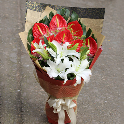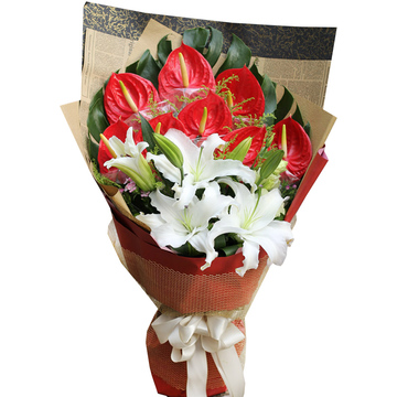 8枝红掌,2枝香水白百合,搭配绿叶、黄莺点缀