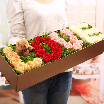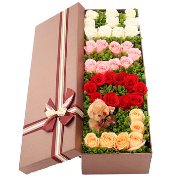 9朵戴安娜玫瑰、10朵红玫瑰、6朵香槟玫瑰、10朵白玫瑰摆成LOVE、一个小熊、黄杨叶铺垫