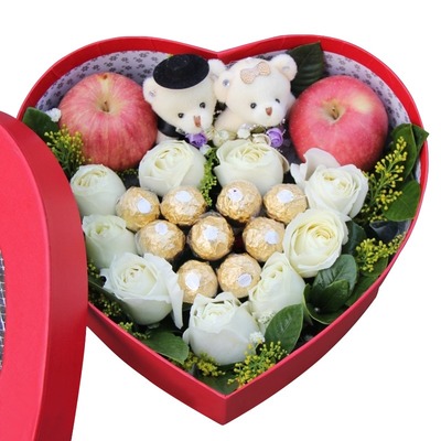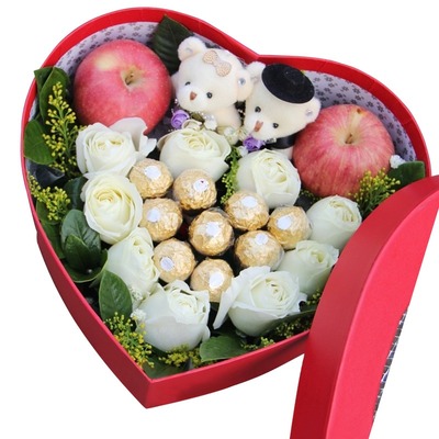 9朵白玫瑰+9颗费列罗巧克力+2个平安果,随机赠送两只可爱小熊,黄莺、栀子叶搭配