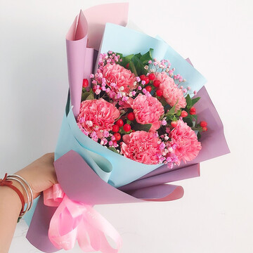 6朵粉色康乃馨,粉色满天星和红豆、栀子叶搭配