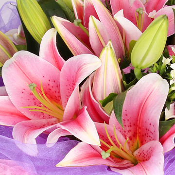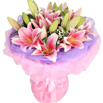 7枝多头粉色香水百合,黄莺+栀子叶+相思梅丰满搭配。