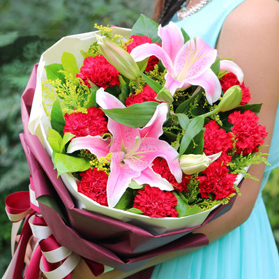 11朵红色康乃馨,2枝多头粉百合,黄莺和绿叶丰满间插