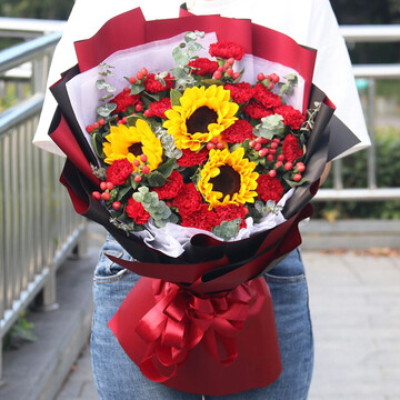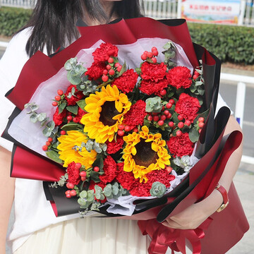 21朵红康3支向日葵,红豆搭配、尤加利间插