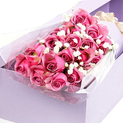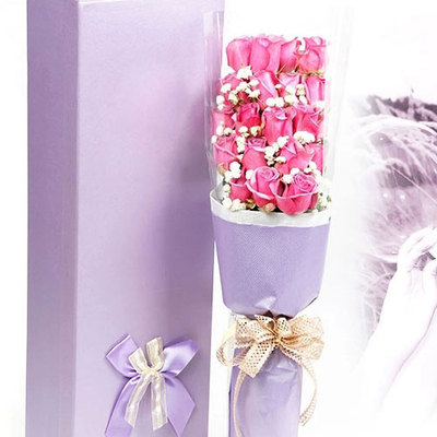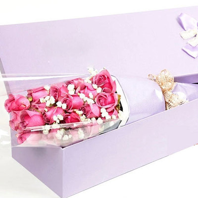 背部透明玻璃纸,正面内衬白色牛油纸,外搭紫色古典纸,手握处衬香槟金法式蝴蝶结。【紫色礼盒】花语:爱是缘分,爱是感动,爱是习惯,爱是宽容,爱是牺牲,爱是体谅,爱是一辈子的承诺。附送: