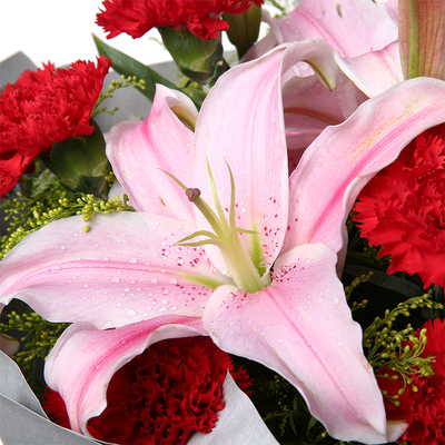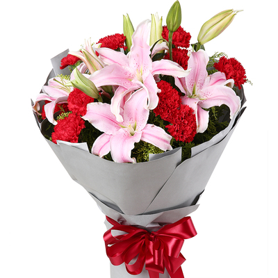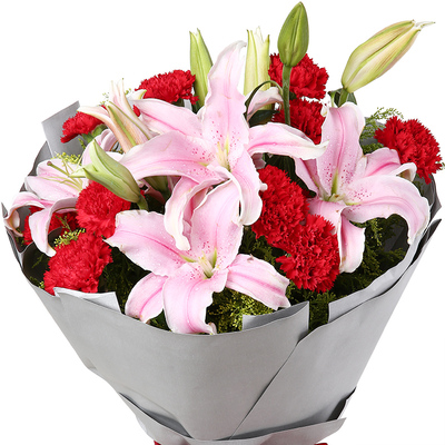 11朵红康乃馨+2枝百合搭配黄莺