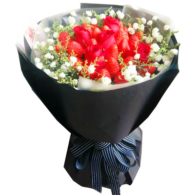 内衬白色雾面纸,外层黑色卡纸圆形包装,黑色花纹丝带蝴蝶结扎束花语:你是我的幸运,并将永远是我的幸运,愿和你一起幸福携手附送: