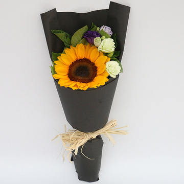 1支向日葵,2枝绿桔梗,2朵紫色桔梗,栀子叶搭配