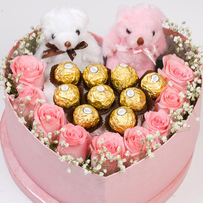 精选9朵戴安娜玫瑰+9颗费列罗巧克力+小熊一对,四周满天星点缀。