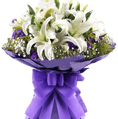 9枝香水百合,搭配黄莺、满天星、勿忘我、绿叶点缀
